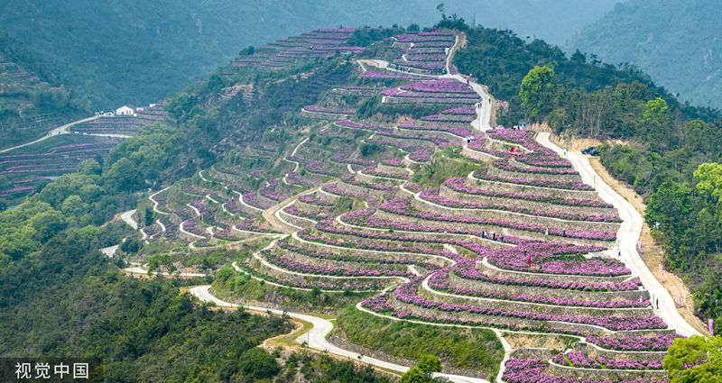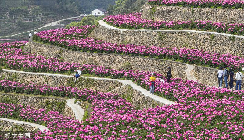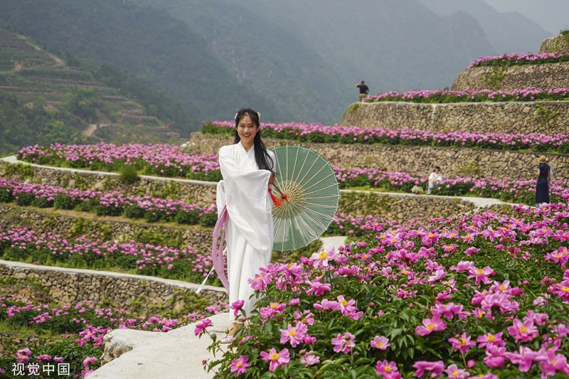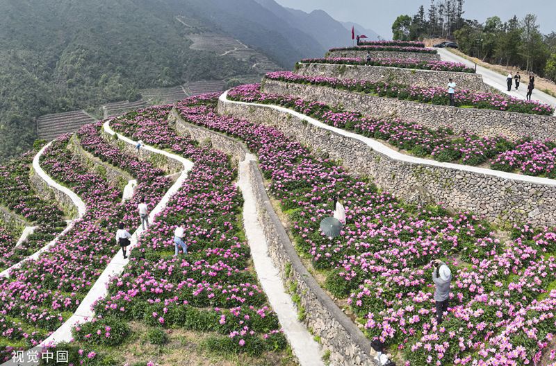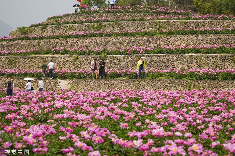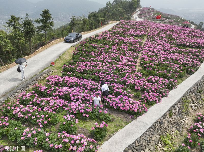 2023年4月18日,浙江温州,乐清前垟村,盛开的芍药花将梯田点缀得春意盎然。