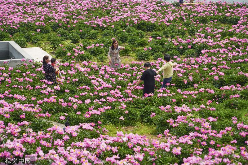 2023年4月18日,浙江温州,乐清前垟村,游客在芍药花丛中赏花游玩。