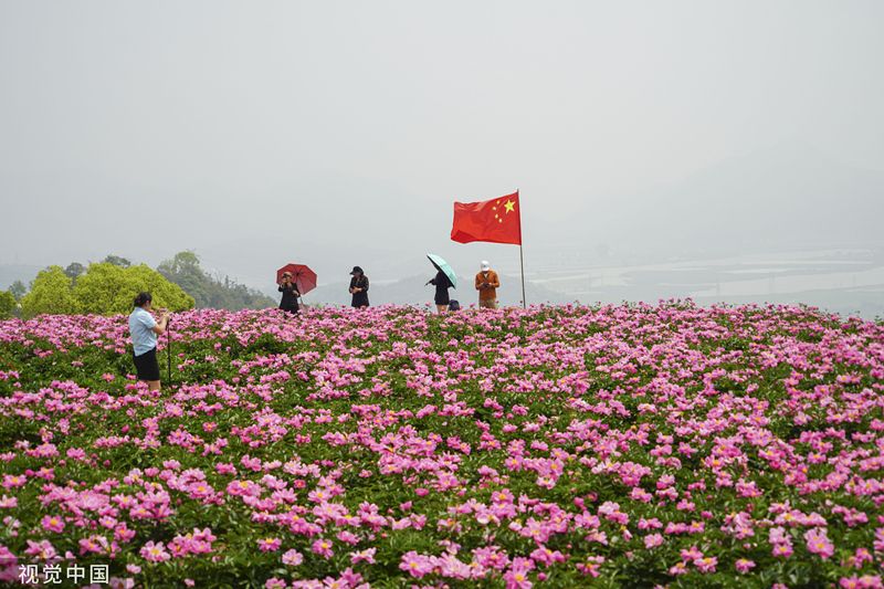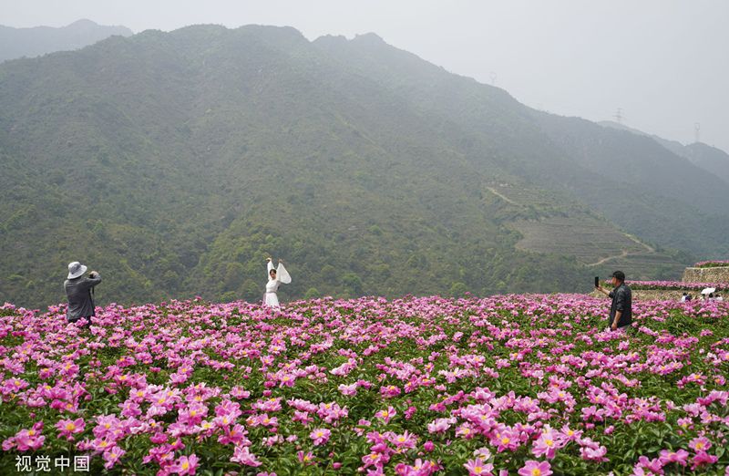 2023年4月18日,浙江温州,乐清前垟村,游客在芍药花丛中赏花拍照。