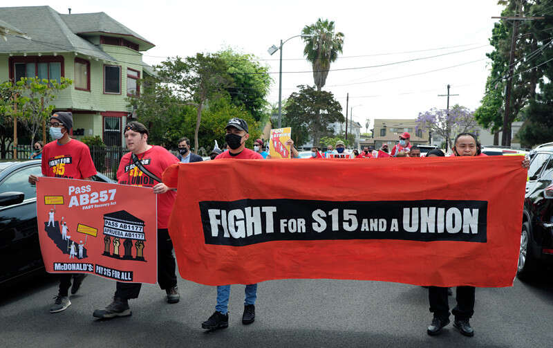 美国洛杉矶民众街头游行,争取15美金时薪。(资料图)