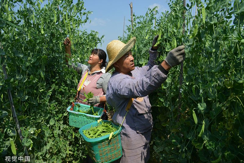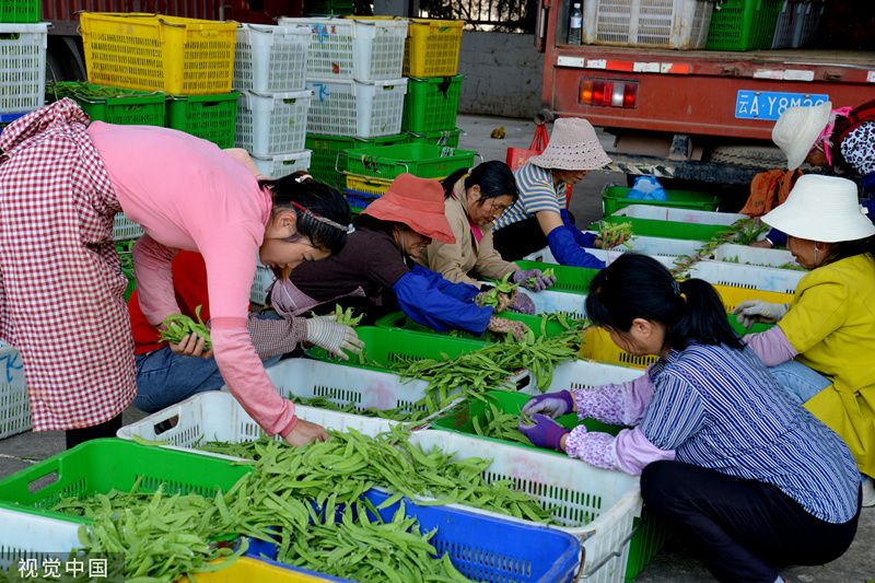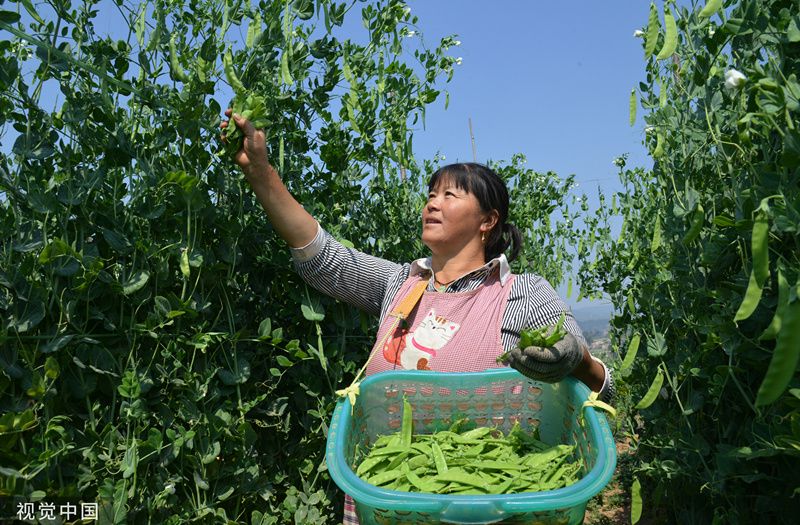 2023年4月18日,云南省昆明市,晋宁区六街镇豌豆种植户正在采收优质鲜食豌豆。