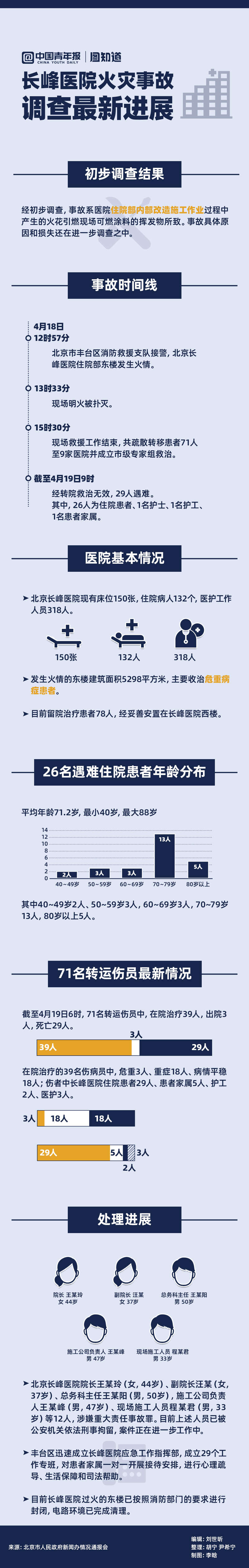 截至4月19日9时,4月18日北京长峰医院火灾事故已造成29人遇难,其中26位为住院患者,平均年龄71.2岁。