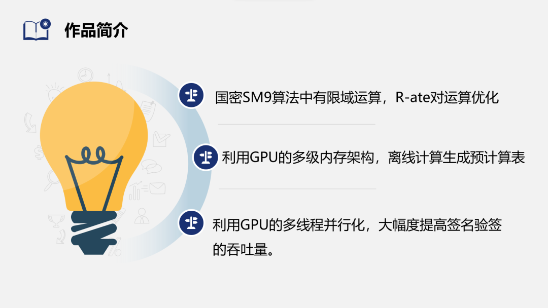 基于此框架,作品最大的亮点,便是利用并发架构设计和优化了SM9算法的实现,使其具有了高吞吐量、低延迟、可扩展性等优点。通过优化,成员们成功地提高了数字签名验证的速度,实现了吞吐量比现有CPU实现方案快1400倍左右的效果。