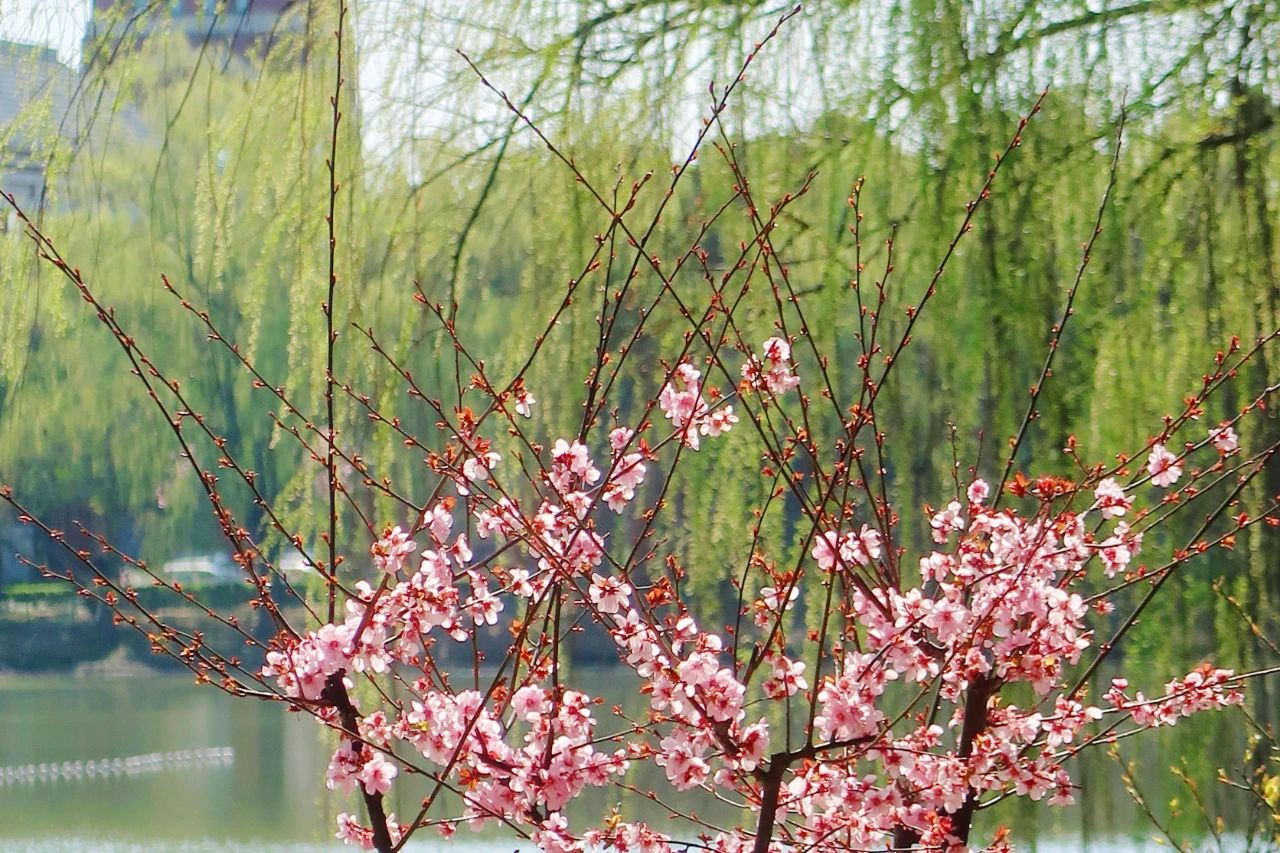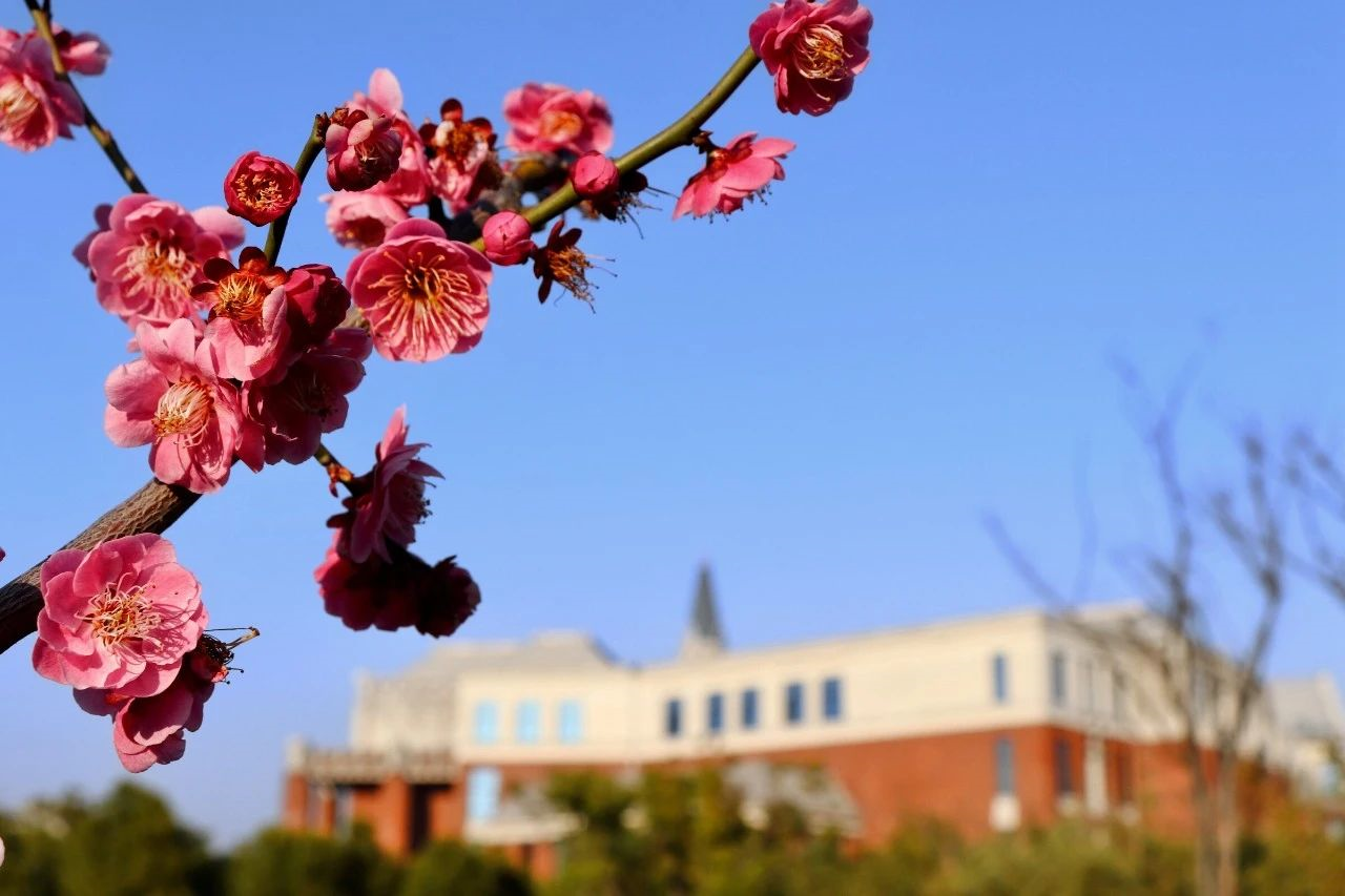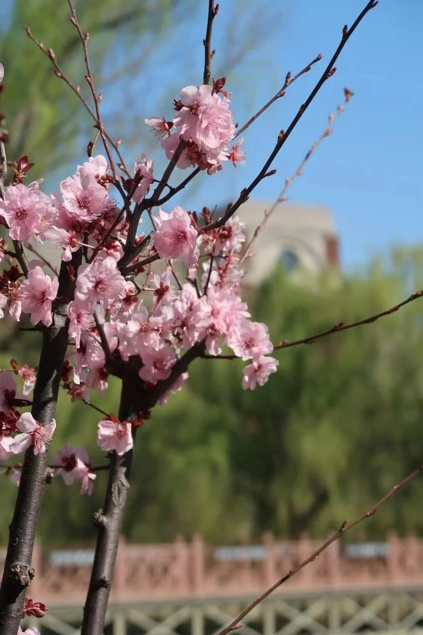 在校史馆附近,朝木桥方向探索,你便会惊讶地发现一枝枝“反季节”的梅花,这是美人梅。