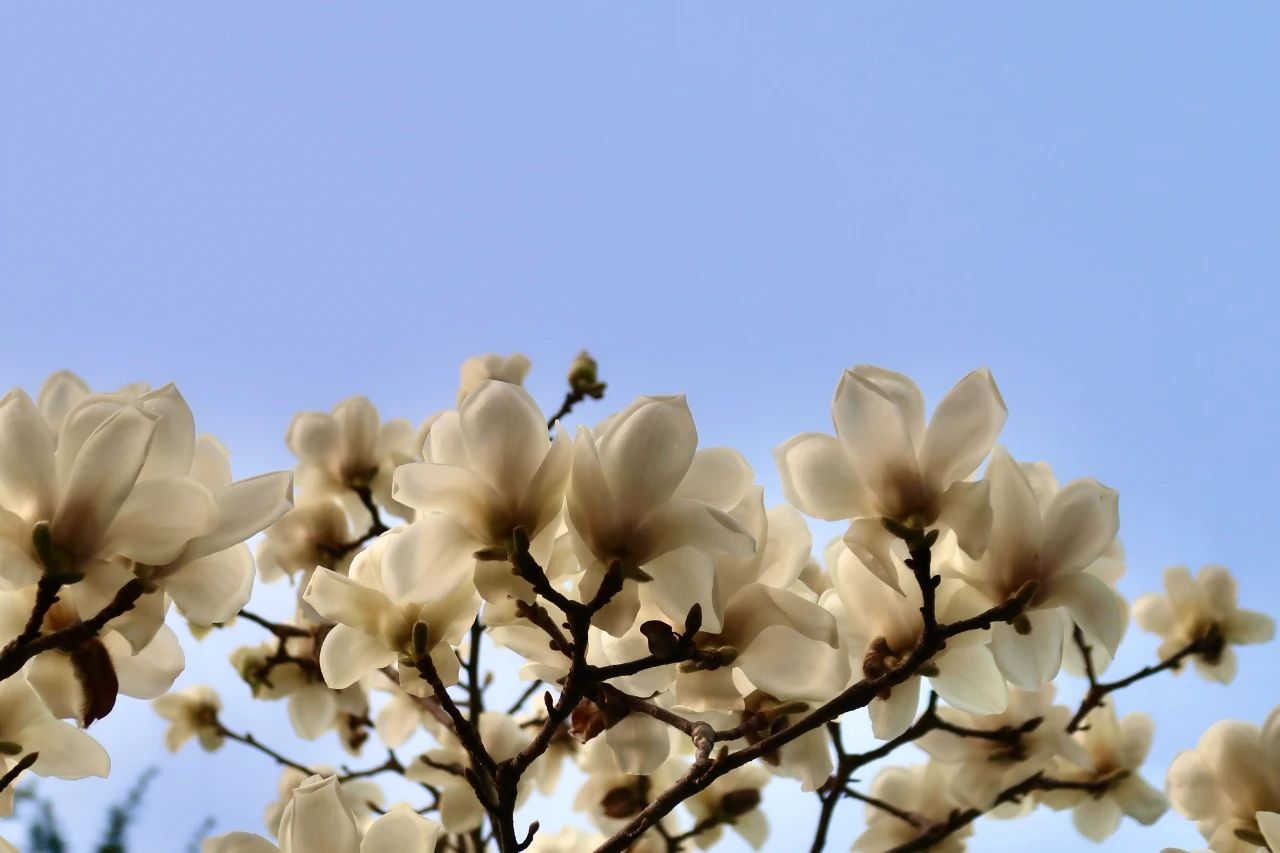 在这条路上,最引人注目的,莫属那在枝头大而洁白、朵朵向上盛开的白玉兰了。