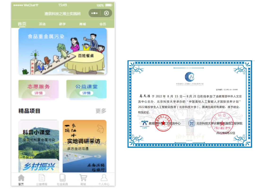用自身所学发挥更大价值, 用知重负重激发使命担当。高天浩学以致用,服务社会。他利用假期积极参与各类志愿服务与社会实践活动,曾在大一大二连续两次参与社会实践。大二暑假加入澧泉科技之湘土实践团,在湖南实地考察镉污染问题,采用实地土壤采样检测、村民采访、发放问卷等多种方式进行调研,通过开发镉污染宣传小程序让更多人认识到镉污染的危害及预防。在大家的共同努力下,团队不仅赢得了当地政府和村民的认可,也取得了团队暑期社会实践银奖和校级先进个人的好成绩。