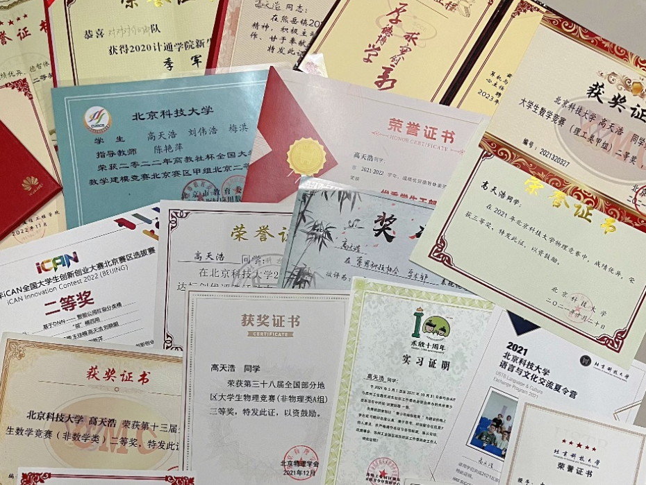 “纸上得来终觉浅,绝知此事要躬行”,竞赛是将所学付诸于实践的最好方式。每一个为竞赛尽心准备的日夜,高天浩并不感到疲惫,他将其视作做好充分准备的蓄力期。备战数模时,他在团队中担任队长和建模手,从题目讨论,到首个模型成功建立,再到不断完善模型,经过组内同学们的集思广益,取得了建模成功的突破性进展。在计算机博弈大赛上,从前几次对决失利到调试程序取得最终胜利,每一次来之不易的逆袭,每一个凝聚着小队三人心血的过程,都是前进道路上的闪亮勋章。志不求易者成,事不避难者进。事实证明,困难和成绩总是相伴相随,困难越大,战胜困难取得的成绩也越大。过去的两年里,高天浩积极参与各类学科和科技竞赛,斩获国家级、市级、校级等10余项奖项。