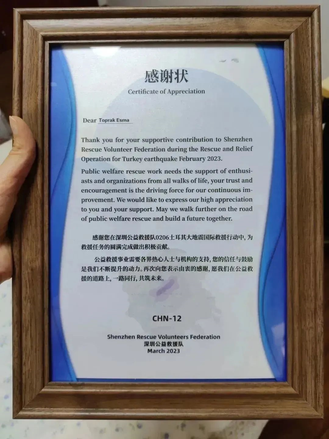 阿诗玛虽然远在深圳,但她还是竭尽全力为救援队收集实时信息,把土耳其语翻译成中文,以便救援队能及时掌握到重要信息,把握好救援机会。阿诗玛也因此获得了一份来自深圳公益救援队的感谢状,上面写着“感谢您在国际救援行动中,为救援任务的圆满完成做出的积极贡献。”