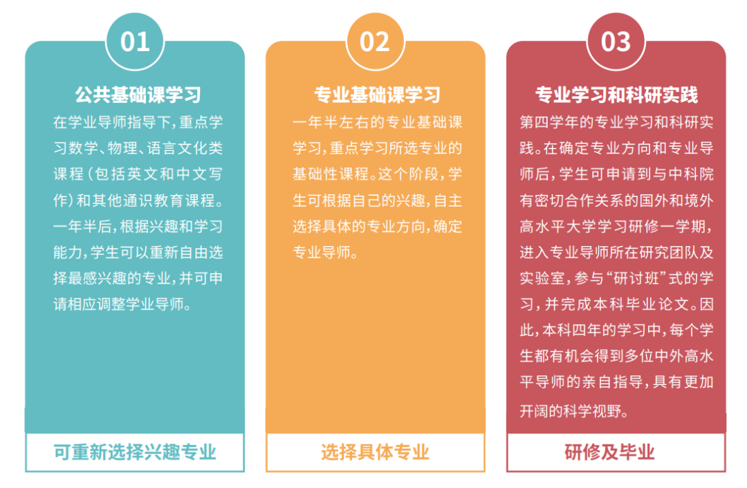 其中,国科大为本科生设计的“三段式”的培养方案,分为第一阶段的公共基础课学习、第二阶段的专业基础课学习和第三阶段的专业学习和科研实践。每位本科生在四年学习中,都有机会得到多位中外高水平导师的亲自指导,开阔更加广泛的科学视野。