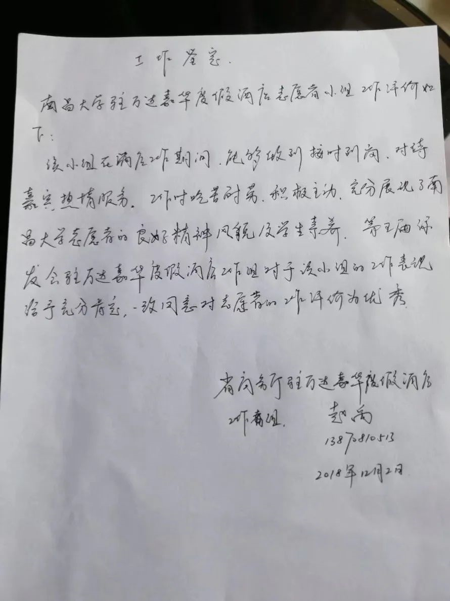 每提起夏侯惠民,18级学生赵福京都会想起自己参加第五届世界绿色发展投资贸易博览会的情景。那是大一的他第一次参加大型赛会,要负责酒店前台的入住人员登记、会议资料发放和基本的礼仪服务,面对复杂的人员统筹和工作安排,毫无经验赵福京显得有些手足无措。每天几次人员清点,分组安排如何进行,轮班值岗如何协调、与老师怎样沟通,所幸有夏侯惠民打电话一一叮嘱,任何一个细节都不放过,赵福京这才圆满完成了志愿服务任务,并得到了组会委的高度赞扬。
