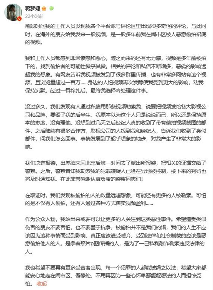4月19日,演员蒋梦婕发布长文称,多年前自己在闹市区被人恶意偷拍裙底,视频近日在网上大肆传播,甚至有人借机勒索,严重影响了其工作生活,蒋梦婕透露,自己和工作人员报警后,借机勒索的嫌疑人已在异地被警方控制。