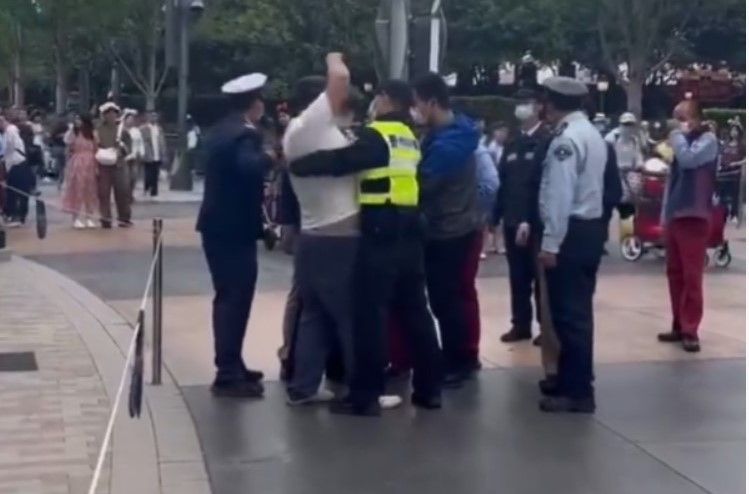 网传视频显示,一名身体壮硕的男子,在上海迪士尼乐园非吸烟区内抽烟,被一位工作人员提醒后,该男子突然发怒,仗着体型优势,动用暴力,一把薅住男性工作人员的脖领子,反复推搡,言语粗鲁,女性工作人员被吓得带着哭腔道歉。之后该男子仍追向人群,穷追不舍,警方随后赶到现场,男子仍在使用暴力,之后却突然倒在地上“躺平”,四仰八叉就地撒泼……这名不文明的游客的行动,导致当天下午的彩色庆典被取消,很多游客没有看成表演。