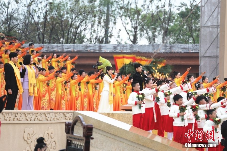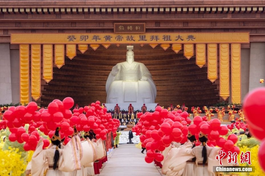 中新社记者 李超庆 摄 4月22日,河南新郑,癸卯年黄帝故里拜祖大典在雨中如期举行。来自海内外的华夏儿女冒雨祭拜人文始祖黄帝。图为拜祖大典“天地人和”环节。