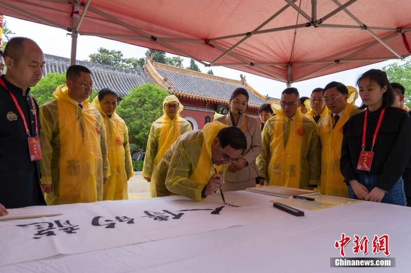 中新社记者 李超庆 摄 4月22日,河南新郑,癸卯年黄帝故里拜祖大典雨中如期在举行。来自海内外的华夏儿女冒雨祭拜人文始祖黄帝。图为新党主席吴成典在黄帝故里祠前留下墨宝。