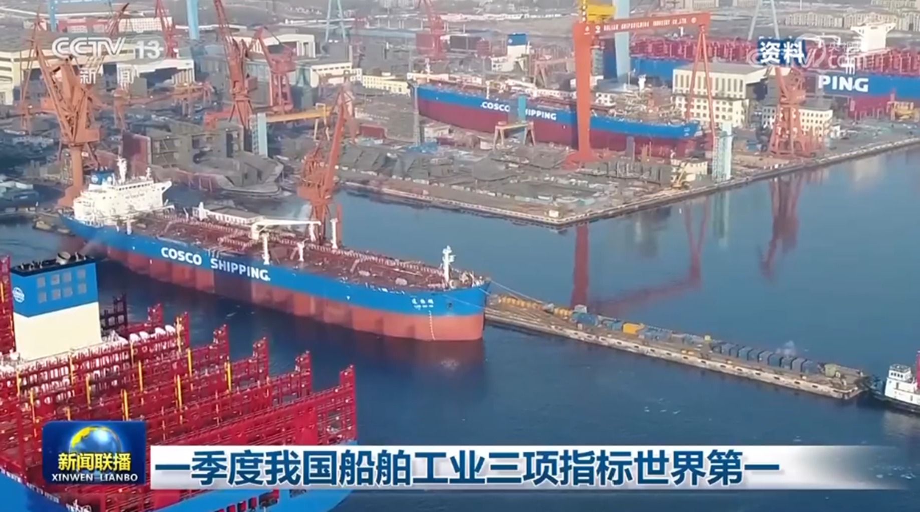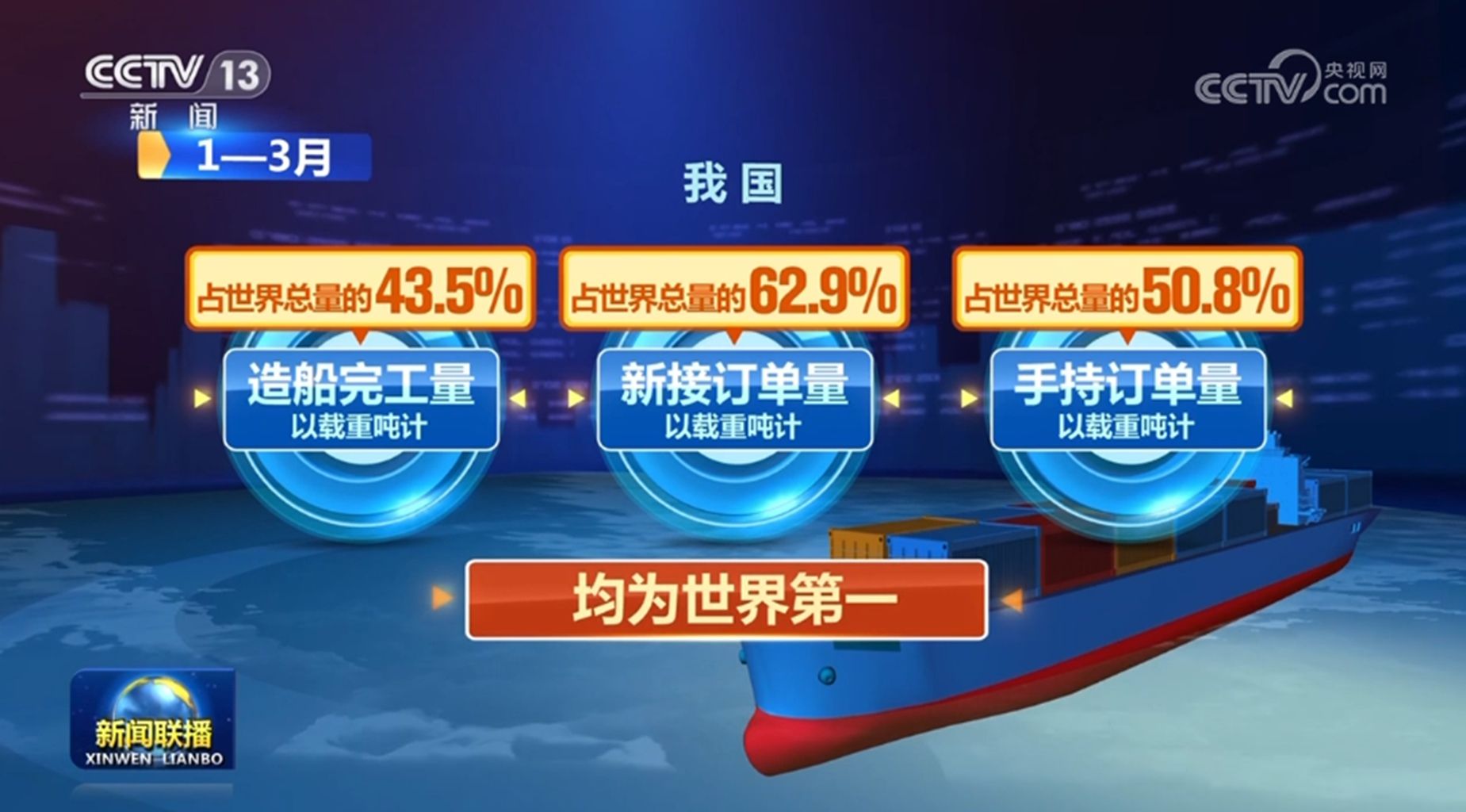 央视网消息(新闻联播):记者从工业和信息化部了解到,今年一季度,我国船舶工业运行企稳回升,多项指标居世界第一。