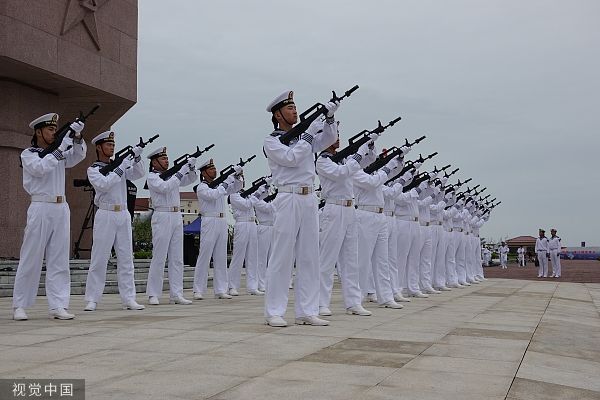 2023年4月23日,青岛,人民海军成立74周年纪念日,《致敬海军英雄》大型典礼在青岛海军博物馆西广场隆重举行,仪式上礼兵向海军先烈们敬献了花篮,鸣笛声中全体官兵向英雄行举手礼,持枪礼兵行行鸣枪礼结束。