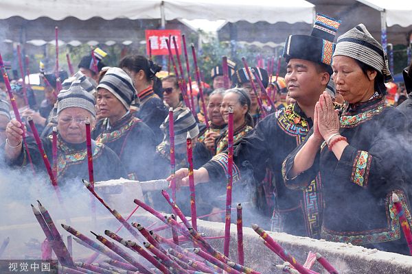 2018年4月22日,广西百色,壮族民众在始祖布洛陀诞生地——田阳县敢壮山举行盛大祭祖活动,来自海内外的数万名民众参加了活动。