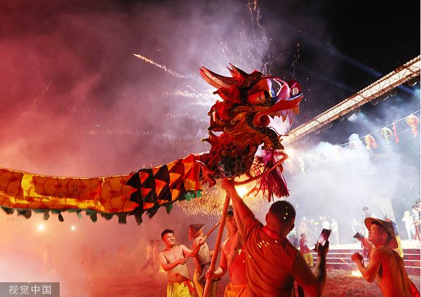 2023年4月22日,南宁,2023年中华民族一家亲——桂台各民族欢度“壮族三月三”民族民俗文化交流活动在南宁市宾阳县举行,与龙共舞活动。