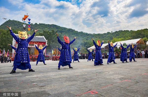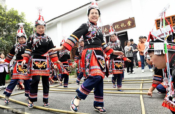 2023年4月22日,江西省上饶市,德兴市香屯街道少数民族村兰村,几名身穿民族服饰的畲族大妈开心跳起独具民族特色的竹竿舞。