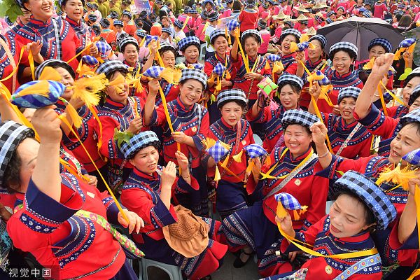 2023年4月22日,贵州黔西南,望谟县布依族妇女在开幕式现场唱布依族民歌。