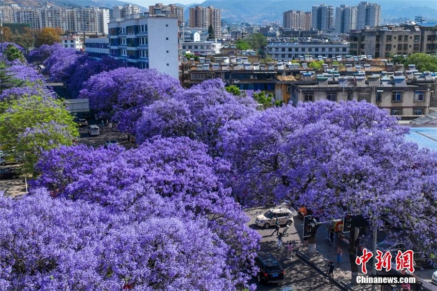 蓝花楹将西昌街头变成了紫色花海。(无人机照片)