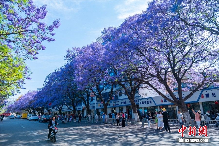 4月23日,四川西昌市城区航天北路、建昌路等处,盛开的蓝花楹吸引了不少民众、游客前往拍照打卡。图为航天北路街道旁盛开的蓝花楹,树下不少游客驻足观赏拍照。