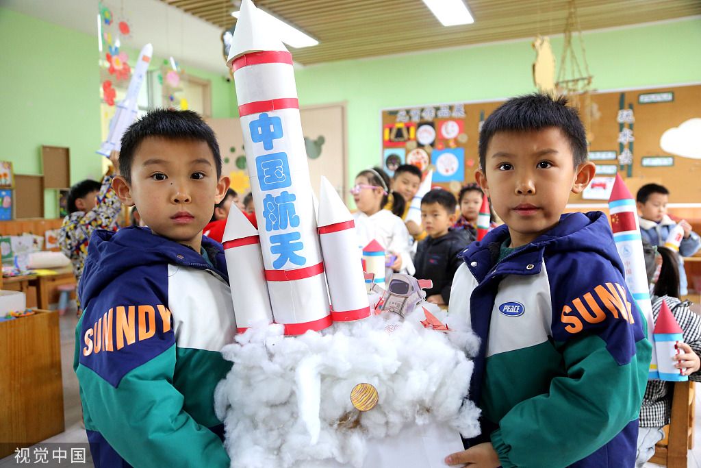 4月24日,江苏连云港,连云区云山中心幼儿园,孩子们展示自己制作的航空航天模型。
