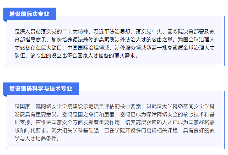 教育部公布了2022年度普通高等学校本科专业备案和审批结果,武汉大学新增3个本科专业,分别是: 智慧水利 、国际法 、密码科学与技术;同时,电子科学与技术、物联网工程、物业管理、数字出版、水质科学与技术、旅游管理6个本科专业准予撤销。至此,全校本科专业数量为130个。