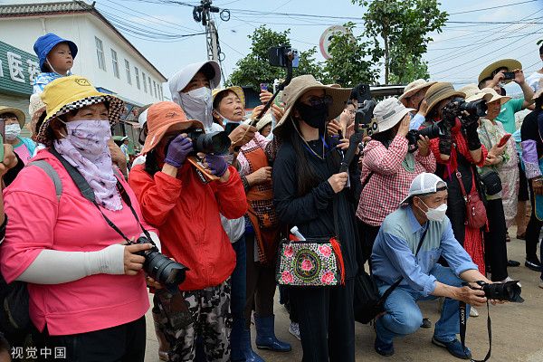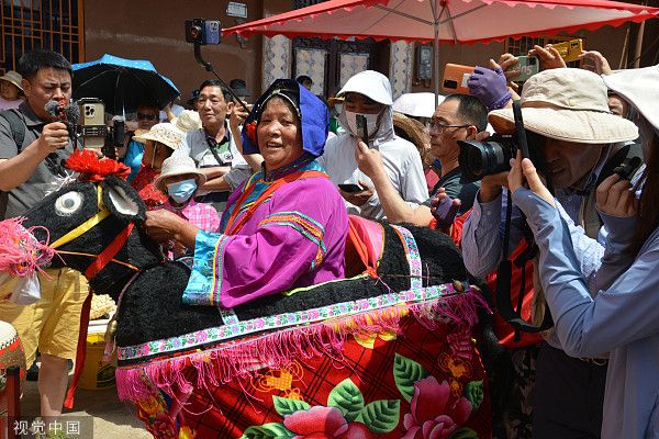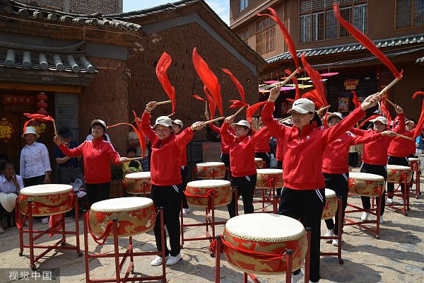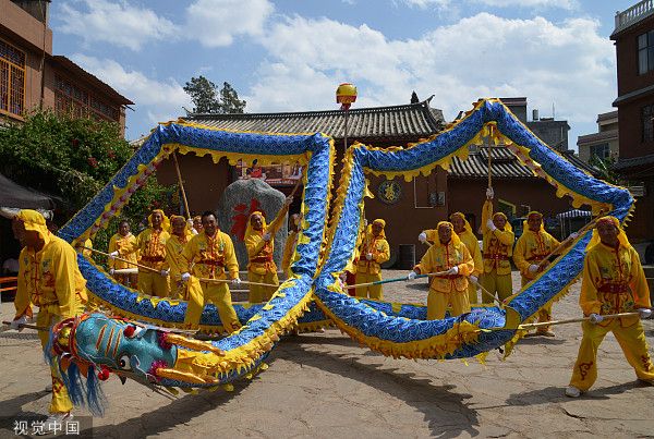 2023年4月24日,昆明,晋宁区福安古村举办一年一度的三月初五传统“祈福节”,彩龙巡游、花灯歌舞、秧佬鼓等传统文艺展演吸引周边村民和外地游客慕名前来“沾福气”。