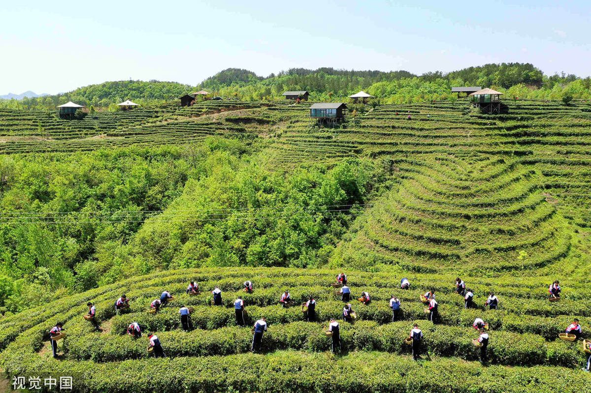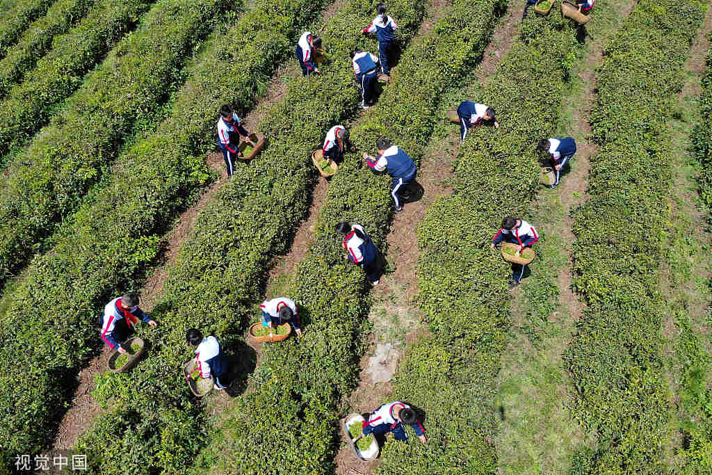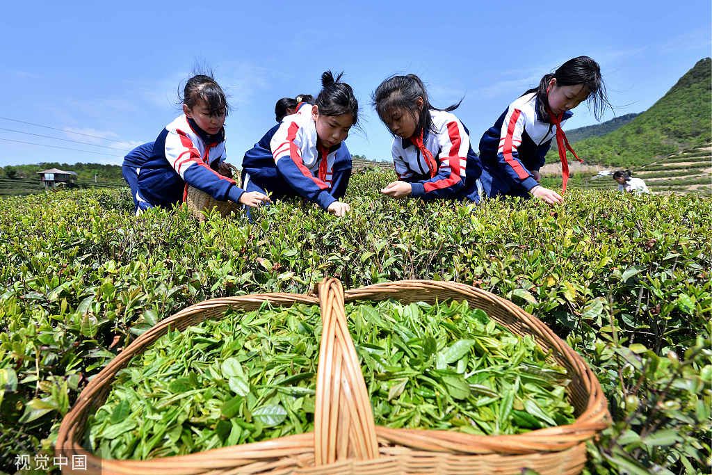 4月25日,湖北襄阳,保康县歇马镇百峰村香炉山茶园,百峰小学的学生在体验采茶。
