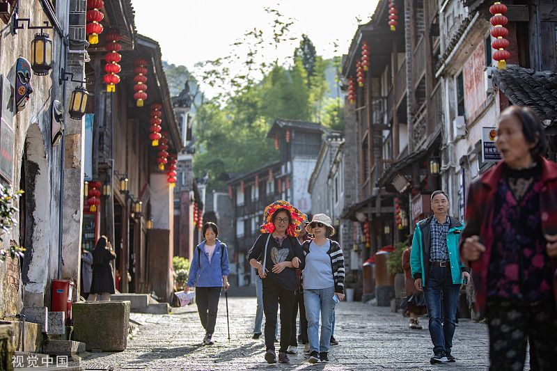 4月25日,重庆,在秀山县边城景区,游客在洪安老街观光游玩。