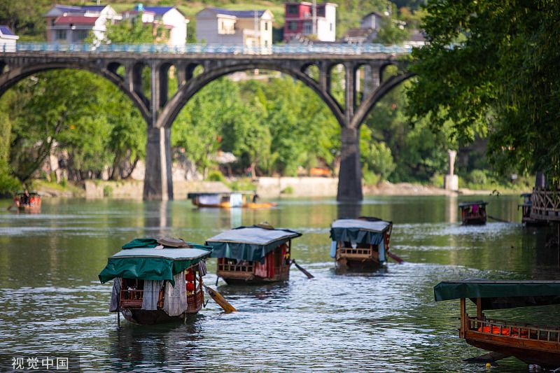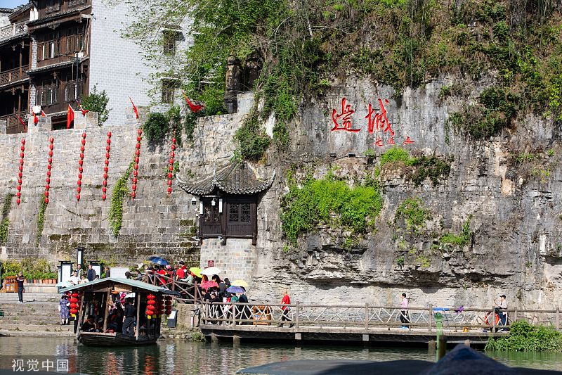 4月25日,重庆,在秀山县边城景区,游客乘坐游船在清水河上观光。