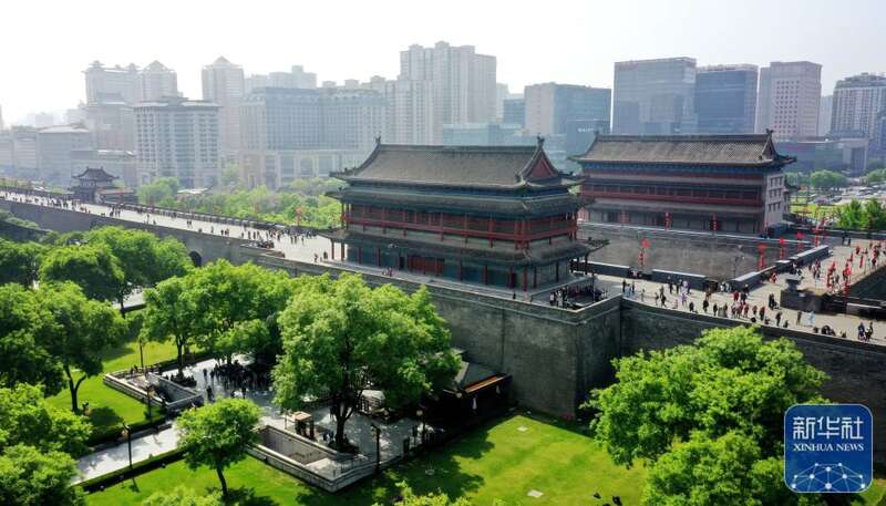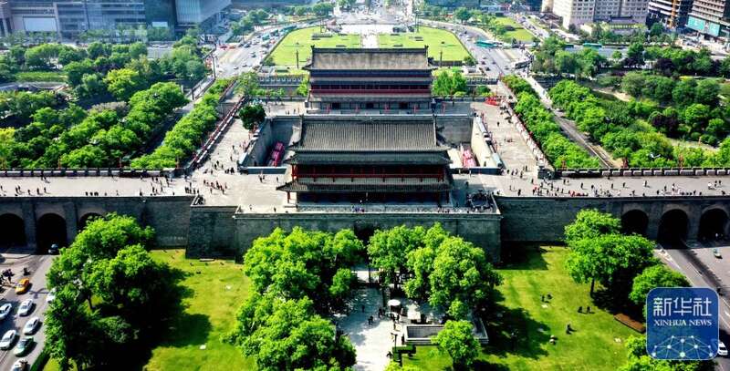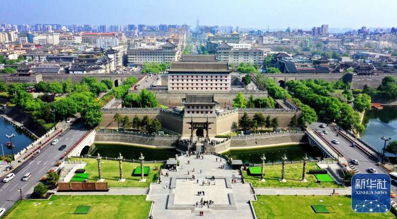 ↑西安明城墙永宁门(4月25日摄,无人机照片)。新华社记者 刘潇 摄