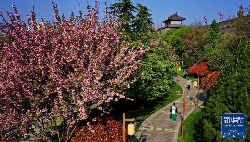 春和景明,万物昭苏,西安明城墙被郁郁葱葱的绿植及绚丽多彩的春花装点一新,成为市民及游客踏春赏景的好去处。