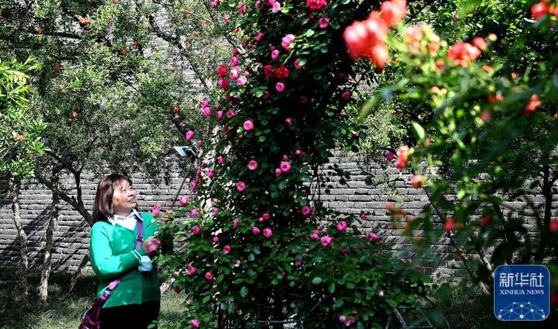 ↑市民在西安明城墙下的环城公园内赏花(4月25日摄)。新华社发(邹竞一 摄)