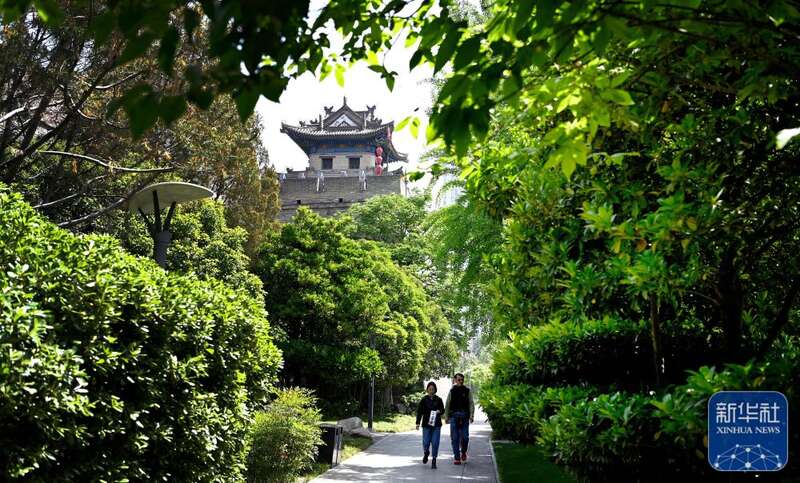 ↑市民在西安明城墙下的环城公园内散步(4月25日摄)。新华社发(邹竞一 摄)
