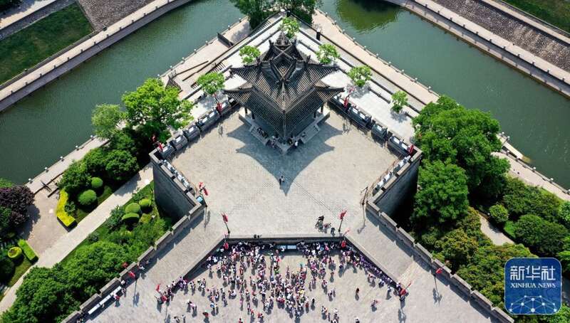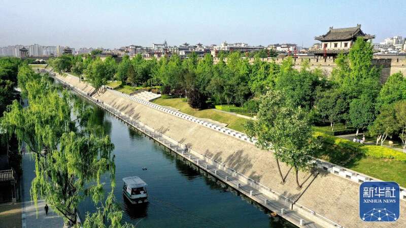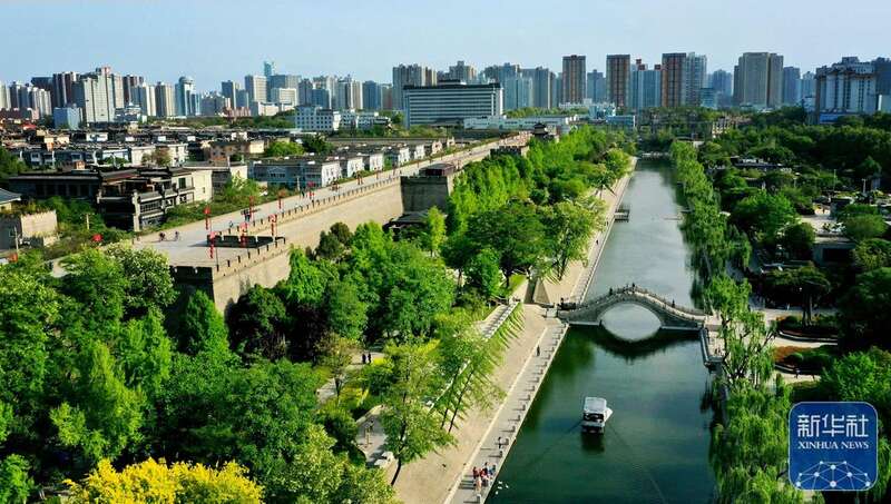 ↑西安明城墙西侧护城河(4月15日摄,无人机照片)。新华社记者 刘潇 摄