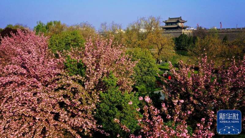 ↑西安明城墙下春花盛开(4月1日摄,无人机照片)。新华社记者 刘潇 摄