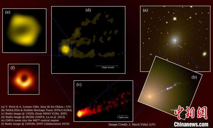 来自中国科学院(中科院)的最新消息说,中科院上海天文台研究员、中德马普伙伴小组组长路如森领导的一个国际研究团队利用在3.5毫米波段开展的最新观测,首次对著名射电星系M87的黑洞阴影以及其周围落入中央黑洞的物质的环状结构和强大的相对论性喷流一起进行成像。该同框图像为首次在3.5毫米波长实现成像,也首次表明了中央超大质量黑洞附近的吸积流与喷流起源之间的联系。