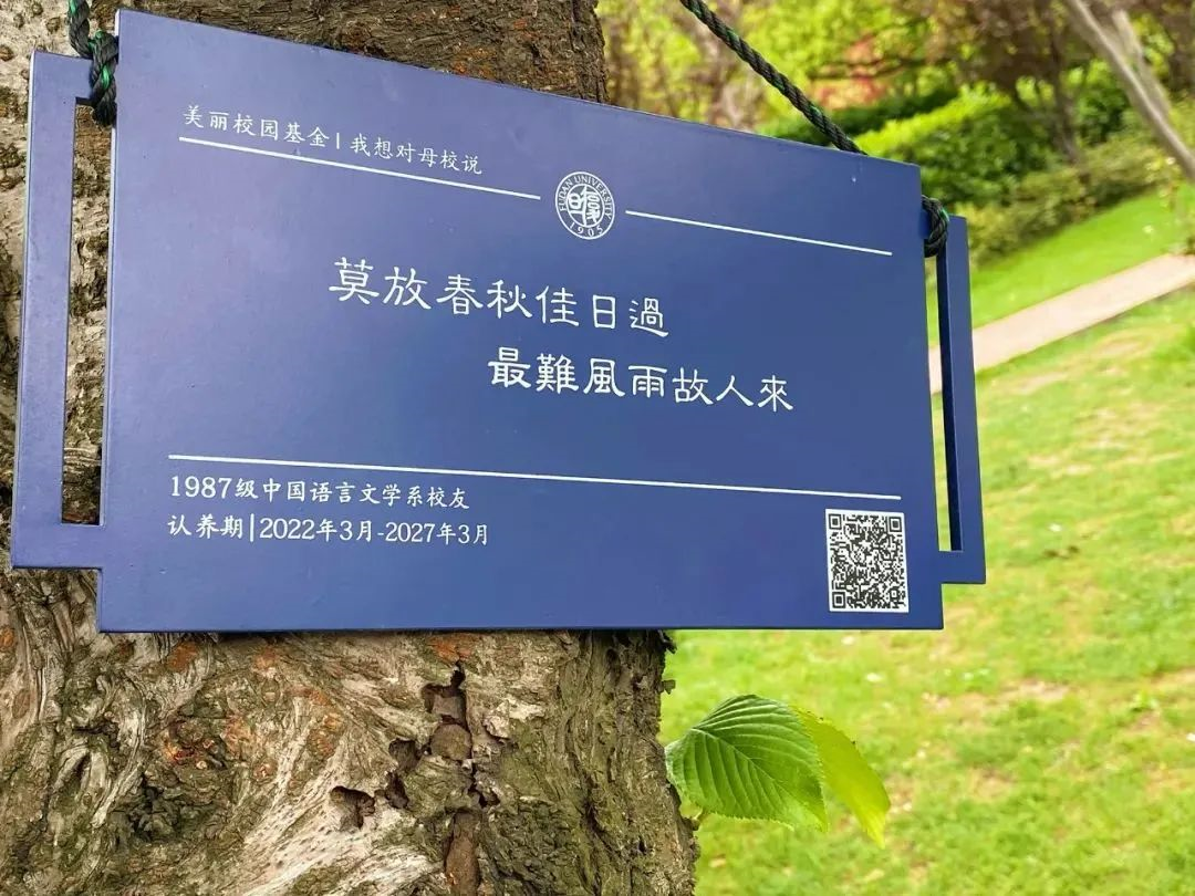 这些樱花树大多已被校友捐款认养,树干上挂有深蓝色的捐赠牌,写着认养人信息和祝福语。