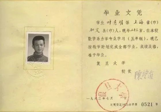于是一位名叫叶秀明的校友向校友办老师发来了自己的毕业证书图片。图片上,浅黄底色的毕业证上贴着一张年轻帅气的男生照片,文字显示他1962年7月毕业于本校数学系力学专业,而右下角校长签名栏中的印戳赫然是“陈望道”三个字。