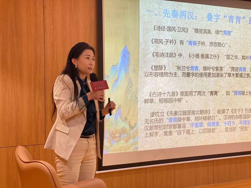 在分享会现场,包岩从多个方面全面阐释了青色丰富的文化底蕴和演变,包括:古籍文献和诗文中的记载,宗教与哲学的内涵,常见词语的语义变迁;绘画、建筑、雕塑中的色彩认知,以及器物、服装(官服)等世俗应用。