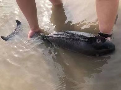 30分钟后,小江豚被大家小心翼翼地放入丁坝外侧的潮水中。江豚入水绕了一圈后依依不舍地游远,像是和大家告别,约十分钟后,江豚游入深水区。走之前,专家告诉民警,这几天他们还会来附近水域滩涂观察,如果看到小江豚回来,他们会采取下一步保护措施。