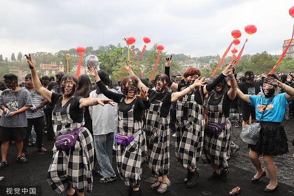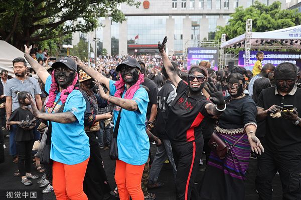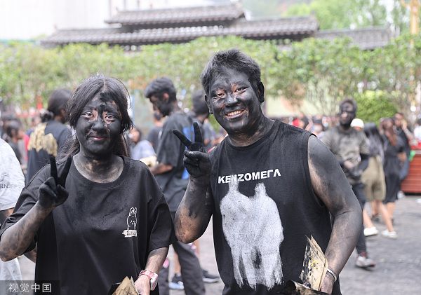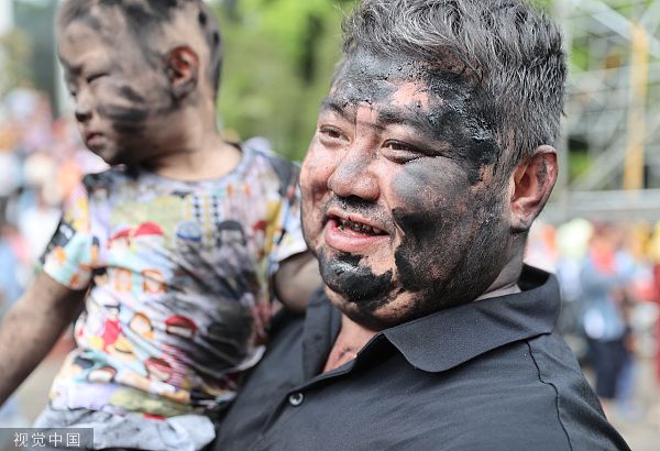 2023年5月1日,云南普洱,第十七届中国墨江北回归线国际双胞胎节暨哈尼太阳节在墨江县举行,哈尼抹黑脸狂欢活动在城区太阳广场举行,市民与游客在指定区域内文明涂抹黑脸,相互真诚祝福,欢度节日。