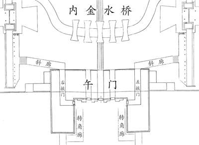 此外,午门自永乐初建以来,其外观形制也不是一成不变的,比如在午门城台南北两侧就曾经出现过“连廊”。据明《万历会典》卷四《朝仪》记载 :“……并序班引廉能官员,各具青锦绣服,至期俱于左掖门内斜廊面北序立……由斜廊行至东廊小礓石察下,面东立……”这两句文献中都提到了“斜廊”,由此可知,斜廊起点在午门城台北侧的左右掖门处,终点在午门以北东西两侧廊庑的礓石察道位置。