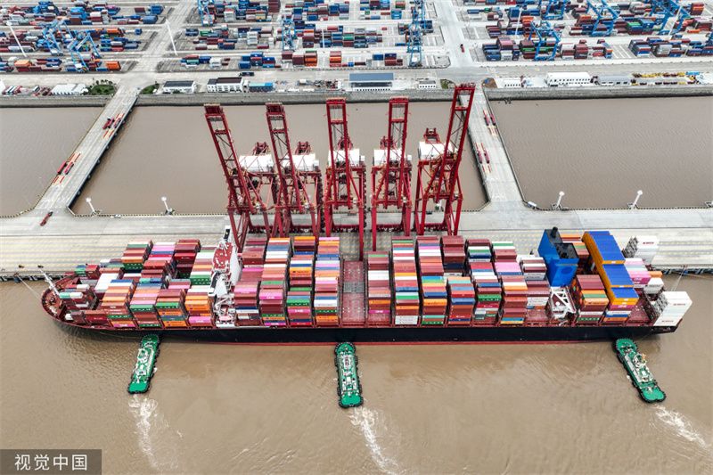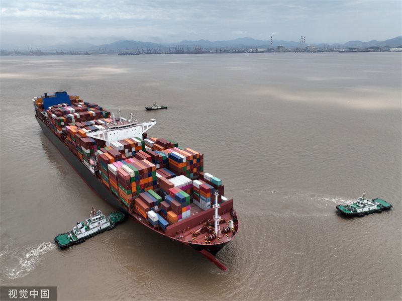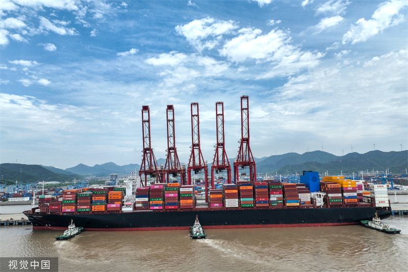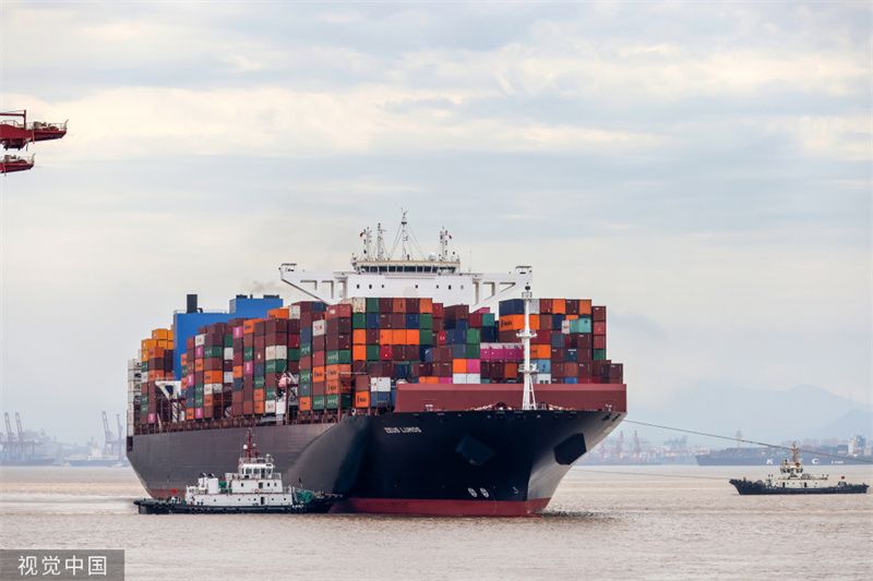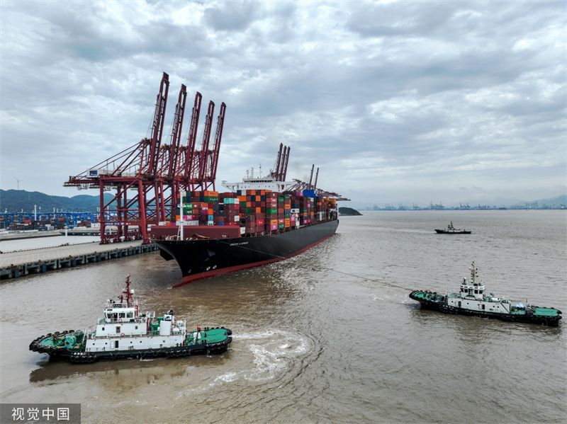 2023年5月4日,浙江舟山港金港区大浦口集装箱码头上,海洋网联宙斯( ZEUS LUMOS)轮完成装卸作业后驶往希腊、意大利等“一带一路”沿线国家。