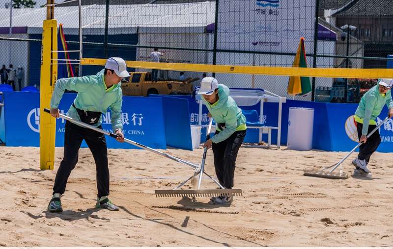 9时比赛开始后,志愿服务的主要任务,落到了场内的“小青荷”身上。耙地、递球、平沙、捡球、翻分……赛场上的“小青荷”干劲满满,充满青春活力。