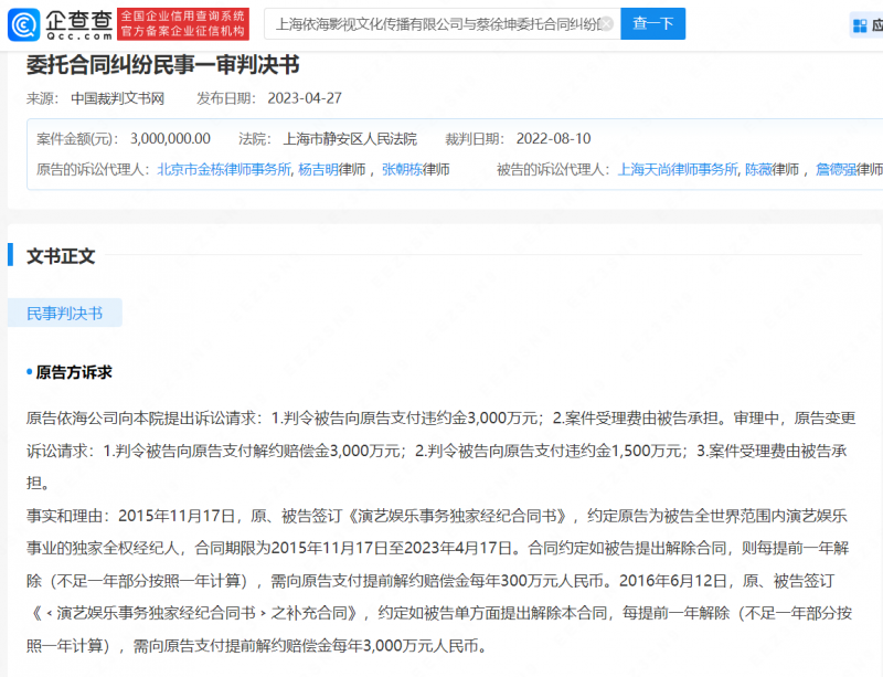 文书显示,原告依海公司诉称,2015年11月,其与蔡徐坤签定《演艺娱乐事务独家经纪合同书》,合约期限为2015年11月17日至2023年4月17日,蔡徐坤单方面提前解约,则每年需赔偿违约金300万元。且2016年双方签定的补充合同中约定,蔡徐坤每提前一年违约,每年需赔偿3000万元违约金。