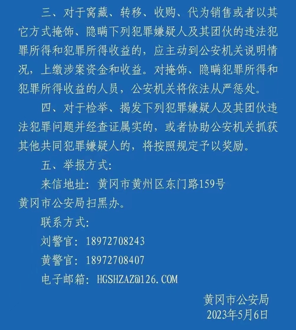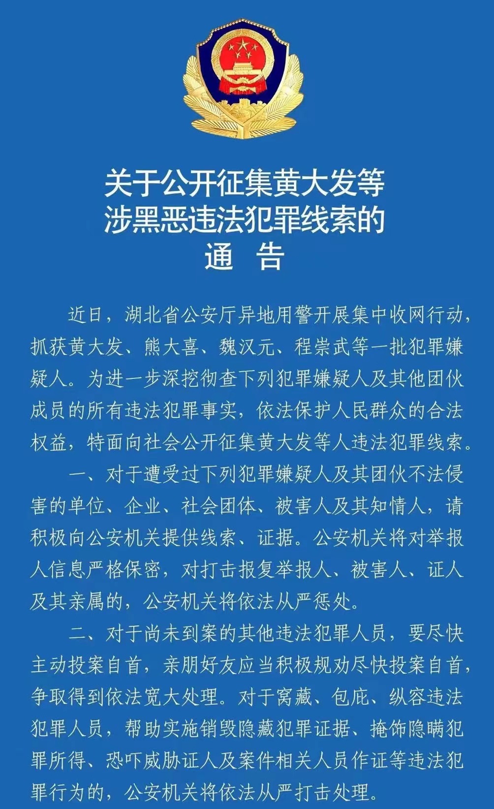 湖北警方表示,对于遭受过黄大发等犯罪嫌疑人及其团伙不法侵害的单位、企业、社会团体、被害人及其知情人,请积极向公安机关提供线索、证据。公安机关将对举报人信息严格保密,对打击报复举报人、被害人、证人及其亲属的,公安机关将依法从严惩处。