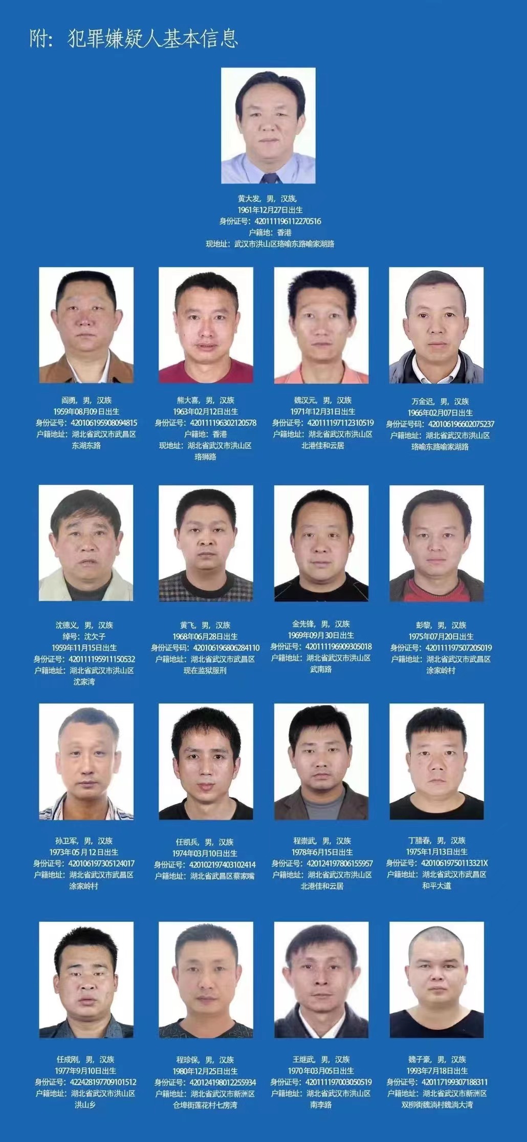 近日,湖北省公安厅异地用警开展集中收网行动,抓获黄大发、熊大喜、魏汉元、程崇武等一批犯罪嫌疑人。为进一步深挖彻查下列犯罪嫌疑人及其他团伙成员的所有违法犯罪事实,依法保护人民群众的合法权益,特面向社会公开征集黄大发等人违法犯罪线索。